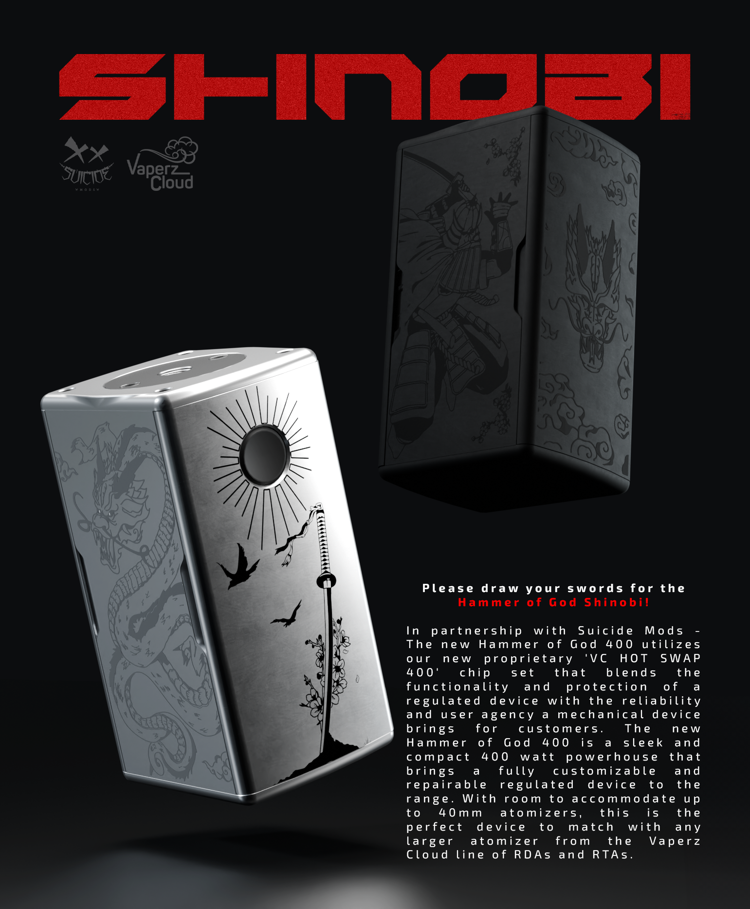 "Hammer of God 400 DROPS! 🔥 400W beast w/ VC HotSwap chipset. Regulated protection + mechanical power. 40mm atomizer support. Shinobi edition! #VaperzCloud #HOG400"